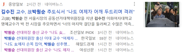 조선일보가 이 기사를 출고하자 중앙일보가 같은날 막바로 받아 <김수진 교수, 故박원순 추도식서 “나도 여제자 어깨 두드리며 격려”>라는 기사를 내보냈다. 뒤이어 <박원순 선대위원장 출신 이대 교수 “여제자 손목 잡는 건 사제 간의 정”>(한국일보), <박원순 前 선대위원장 교수 "나도 여학생 손목 잡아…중상모략“>(한국경제), <“나도 女제자 손목 잡아, 박원순 성추행은 중상모략”…이화여대 교수 주장>(헤럴드경제), <박원순 선대위원장 출신 교수 “나도 제자 손목 잡고 얼싸 안아…자연스러운 정 나눔”>(여성신문) 등 대동소이한 제목의 기사가 쏟아져 나왔다. 이번에도 조선일보가 먼저 쓰고 다른 매체들이 따라쓰는 전형적인 ‘조선 베껴쓰기 패턴’이 반복된 것이다.