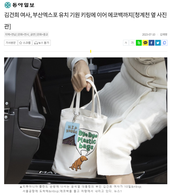 대통령실 출입기자의 전용기 동승 취재는 기자들에게는 아주 큰 취재 기회요 특별한 혜택이다. 그 기회와 특혜는 국민들이 준 것이다. 10일 김건희 씨가 ‘바이바이 플라스틱 백’이라는 문구가 적힌 친환경적 에코백을 들고 전용기를 탔다는 뉴스가 나왔다. 그러나 이보다는 핵오염수 방류로 우리나라 인근 바다의 해양생태계가 오염되는 것이 더 중요한 환경 문제라는 점을 기자들이 알아주면 좋겠다. 김건희 씨의 패션쇼 기사가 클릭수를 높일지는 모르겠지만, 경기도 양평의 김건희씨 일가 땅 7000평 때문에 고속도로 노선이 하루아침에 바뀐 이유 때문에 김건희 씨에 대한 관심이 더 높아졌다는 점도 잊지 말아주길 바란다.