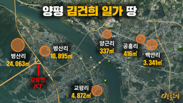 김건희 씨 일가의 양평 토지는 이번 게이트의 시발점이 된 김건희 씨 명의가 포함된 12필지 등 강상면 병산리 21필지와 교평리 3필지, 양평읍의 백안리 2필지, 양근리 3필지, 공흥리 3필지 등 양평군 강상면과 양평읍 일대에 산재해 있다.