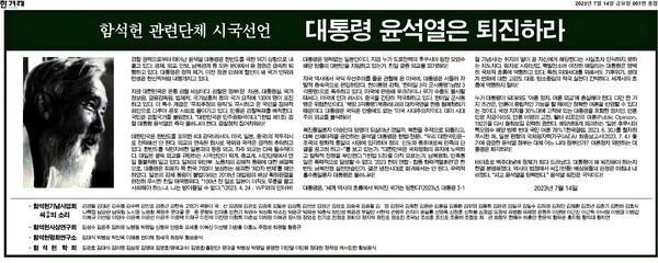 함석헌기념사업회 씨ᄋᆞᆯ의 소리, 함석헌 사상연구회, 함석헌 평화연구소, 함석헌 학회 등 함석헌 관련 4개 단체가 14일 ‘대통령 윤석열은 퇴진하라’는 제목의 공동 시국선언문을 발표했다.