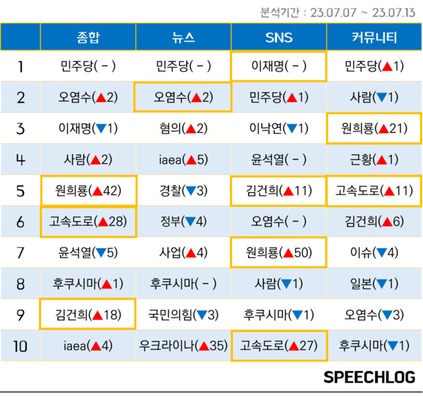 일본 핵 오염수 이슈도 사그라들지 않고 있다. 언론뿐 아니라 SNS, 커뮤니티에서도 ‘오염수’ ‘후쿠시마’ ‘일본’ 키워드는 지난주에 이어 여전히 10위권 내에 머물렀다. 2주전 IAEA 그로시 사무총장의 최종보고서 공개와 지난주 서울 방문 및 야당 면담, 윤석열 대통령이 기시다 총리를 만나 오염수 방류를 인정했다는 소식 등이 이어졌기 때문이다.