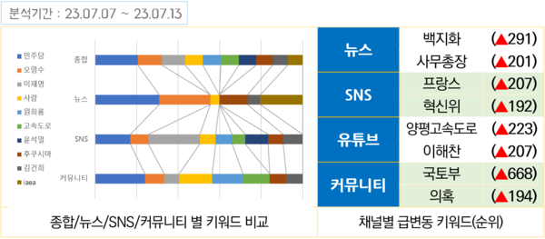 SNS에서 ‘김건희’ 키워드는 11단계 오른 5위, ‘원희룡’은 50단계나 상승한 7위, ‘고속도로’는 27단계 오른 10위를 기록했다. 이번 특혜 의혹과 관련된 키워드가 3개나 10위권 내에 든 것이다. 커뮤니티에서도 ‘원희룡’(3위) ‘고속도로’(5위) ‘김건희’(6위)가 순위 급상승하면서 10위권 내에 새로 진입했다. 유튜브에서는 ‘양평고속도로’가 223단계, 양평고속도로 특혜 의혹을 제기했다는 이유로 국민의 힘으로부터 고발당한 ‘이해찬’이 207단계나 급상승했다.
