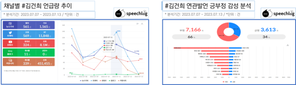 ‘김건희’ 키워드 연관발언의 긍부정 감성어 분석 결과, ‘부정’이 66%로 긍정 34%의 2배에 육박했다. 주요 부정어로는 ‘부인’ ‘게이트’ ‘가짜뉴스’ 등이었고, 긍정어로는 ‘추진’ ‘진실을’ ‘중요한’ 등이 언급됐다.
