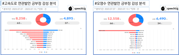 ‘오염수’ 연관발언은 66%가 부정, 34%가 긍정으로 지난주 부정:긍정 비율 67%:33%와 큰 차이가 없었다.