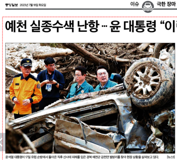 이번처럼 재난 피해 지역을 방문한 대통령이 피해 지역을 둘러보는 장면, 피해 주민을 만나는 장면도 마찬가지다. 대통령이나 고위 공직자의 재난 현장 방문 사진은 늘 비슷한 구도, 비슷한 모습이다. 수행원과 경호원을 우르르 대동하고 어지럽혀진 현장을 둘러보거나 피해 주민과 대화하는 장면이다. 이렇게 판에 박힌 장면이 매번 등장한다. 언론이 굳이 사진으로 보여주지 않아도 알 수 있는 그림이다.
