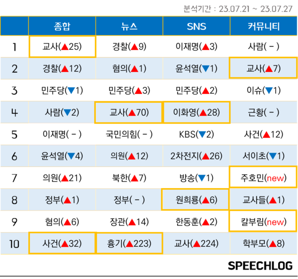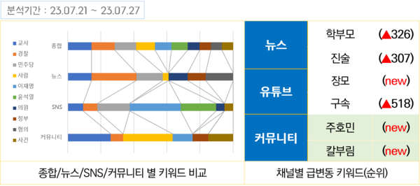 커뮤니티에서는 ‘교사’ ‘서이초’ ‘주호민’ ‘학부모’ 등 서이초 교사의 안타까운 죽음과 관련된 키워드 언급량이 집중적으로 증가했다. 유튜브에서는 언론이 거의 다루지 않은 윤석열 대통령 장모-김건희씨 모친인 최은순씨 법정구속 사건이 빅이슈가 되어 ‘장모’ ‘구속’ 키워드가 크게 증가했다.