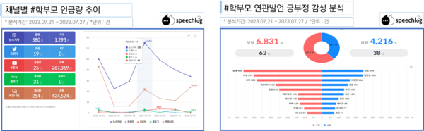 학부모 갑질에 따른 서이초 교사 자살 사건 관련, ‘학부모’ 연관발언 분석 결과는 부정 감성어 비중이 62%였다. 주요 부정어로는 ‘침해’ ‘악성’ ‘사망’ ‘아동학대’ ‘갑질’ 등이었고, 긍정어로는 ‘보호’ ‘정당한’ ‘다양한’ 등이었다.
