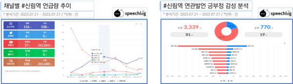 신림역 칼부림 난동과 관련해, ‘신림역’ 연관발언은 부정어가 81%로 압도적이었다. 가장 많은 부정어는 ‘살인’ ‘구속’ ‘협박’ ‘범죄’ ‘무차별’ 등이었다.