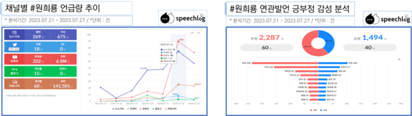 김건희씨 일가 고속도로 특혜 의혹에서 언론이 이를 ‘정치공방’이나 ‘정쟁’ 관점에서 보도하고 원희룡 국토부 장관의 발언에 초점을 맞추다보니, ‘원희룡’은 언론과 디지털 플랫폼 모두에서 언급량이 많았다. ‘원희룡’ 연관발언 긍부정 감성어 분석에서는 60% 대 40%로 부정이 높았다.