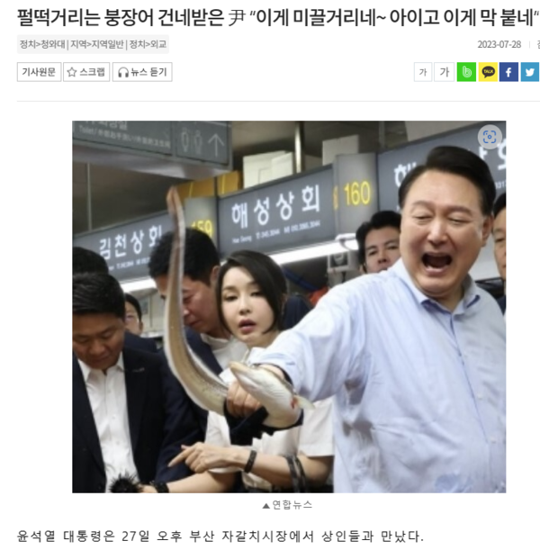 ‘펄떡거리는 붕장어 건네받은 윤, 이게 미끌거리네~아이고 이게 막 붙네’/ ‘붕장어에 물린 대통령’/ ‘붕장어 맨손으로 잡은 대통령’/ ‘윤, 즉석 붕장어회 비빔밥 먹방 이유는’/ ‘현명한 국민, 괴담에 안 흔들려’