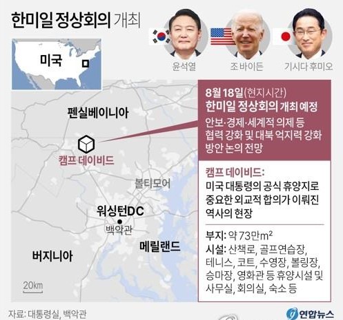 캠프 데이비드는 역대 미국 대통령이 세계 지도자들을 초청해 역사적 합의를 끌어낸 곳으로 잘 알려져 있다. "3국 관계의 새로운 장을 축하하게 될 것"이라는 장-피에르 백악관 대변인의 말에서 드러나듯 세 정상은 한‧미‧일 군사동맹을 향한 발걸음을 재촉할 것으로 보이고, 이는 북한과 중국, 러시아의 반발을 불러 한반도와 동아시아는 언제 충돌이 벌어져도 놀랍지 않는 국면으로 내몰릴 것으로 예상된다.