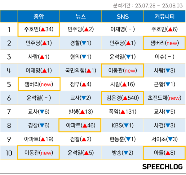 커뮤니티에서 언급량 1위는 ‘주호민’이었다. 전주부터 커뮤니티 이용자들은 초등학교 교사의 죽음에 큰 관심을 보여왔다. 학부모 갑질 논란 속에 자녀가 다닌 특수학급 관련 발언으로 주목을 받고 있는 웹툰작가 ‘주호민’과 함께 ‘교사’ ‘서이초’ 등 관련 키워드가 커뮤니티에서는 계속 10위권에 머물고 있다. ‘나라 망신 현실화’를 불러온 새만금 잼버리 대회 파국 사태가 커뮤니티에서는 빅이슈로 순위 2위까지 치솟았고 국내 개발 ‘초전도체’도 6위에 올랐다.