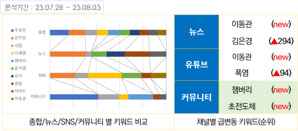 지난주 SNS와 커뮤니티, 유튜브 등 디지털 플랫폼에서는 ‘이동관’ ‘김은경’ ‘폭염’ ‘잼버리’ ‘초전도체’ ‘주호민’ 키워드가 급상승했다.