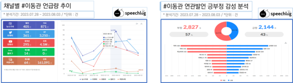 주요 키워드의 연관발언 긍부정 분석에서는 ‘이동관’ 키워드의 경우 부정어가 57%로 43%의 긍정어를 앞섰다. 주요 부정어로는 ‘학폭’ ‘의혹’ 등이었고 긍정어는 ‘공정한’ ‘임명’ 등이었다.