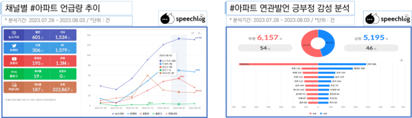 ‘아파트’ 키워드도 부정어 54%와 긍정어 46%로 나타났는데, 주요 부정어는 ‘못한’ ‘피해’ ‘오류’ 등이었고 긍정어는 ‘안전’ ‘제대로’ 등이었다.