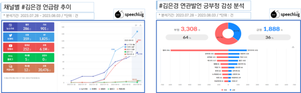 ‘김은경’ 키워드는 부정어 64%, 긍정어 36%였다. 주요 부정어는 ‘폄하’ ‘상하게’ ‘상처’ 등이었고 긍정어는 ‘민주주의’ ‘정중히’ ‘혁신’ 등이었다.