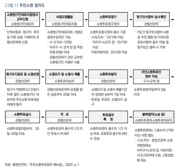 우리나라는 2006년 5월 ‘주민소환에 관한 법률’을 제정했다. 제도가 본격적으로 시행된 2007년 이후 2022년 말까지 주민소환투표까지 진행한 선출직 지방공직자는 11명이고 이 중 기초의회의원 2명이 해직됐다.