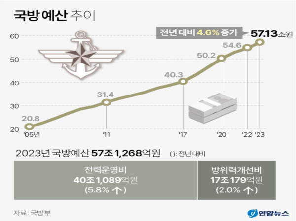 국방부가 국회에 제출한 2023년도 국방예산안의 전체 액수인 57조 1268억원 가운데 군사력 건설을 위한 방위력 개선비는 17조 179억원, 군사력 운영을 위한 전력 운영비는 40조 1089억원이다. 방위력 개선비가 총액의 29.8%에 그치고 있으며, 반면에 전력 운영비는 70.2%를 차지하고 있다.