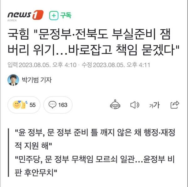 행사 파행이 걷잡을 수 없는 상황으로 치닫자 패닉에 빠진 정부와 여당이 ‘전 정권 책임론’, ‘지자체 책임론’을 꺼내들었다. 윤석열 정부의 상습적인 ‘전 정권 탓’ 책임 회피를 언론은 다시 받아쓰기에 나선 것이다. ‘문재인 정부와 전북의 부실 준비로 잼버리가 위기에 빠졌으니 이를 바로잡고 책임 묻겠다’는 국민의힘 주장이 여러 언론에 그대로 실렸다.