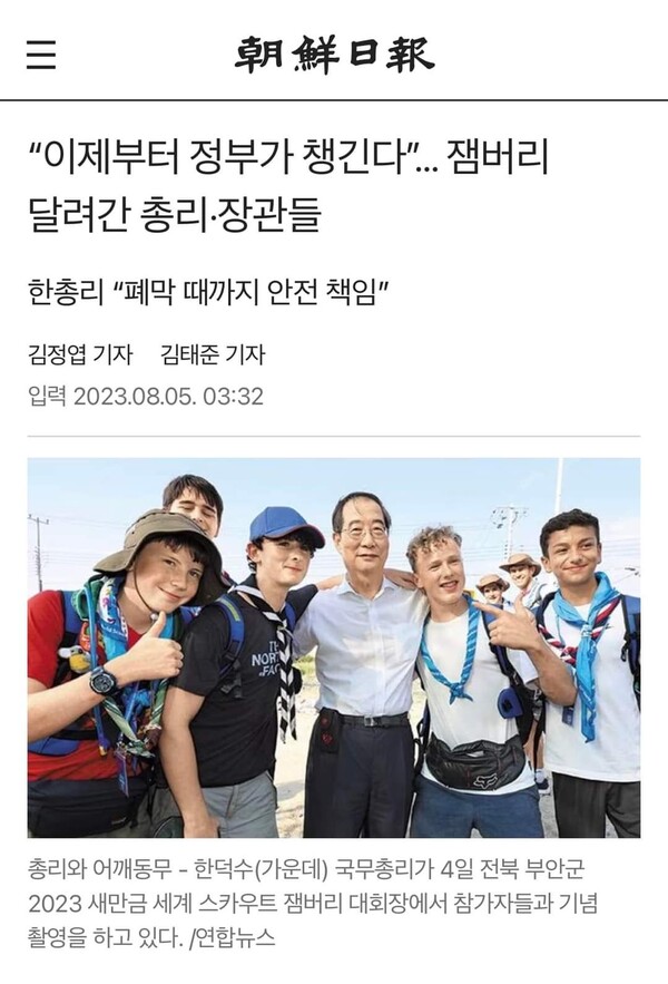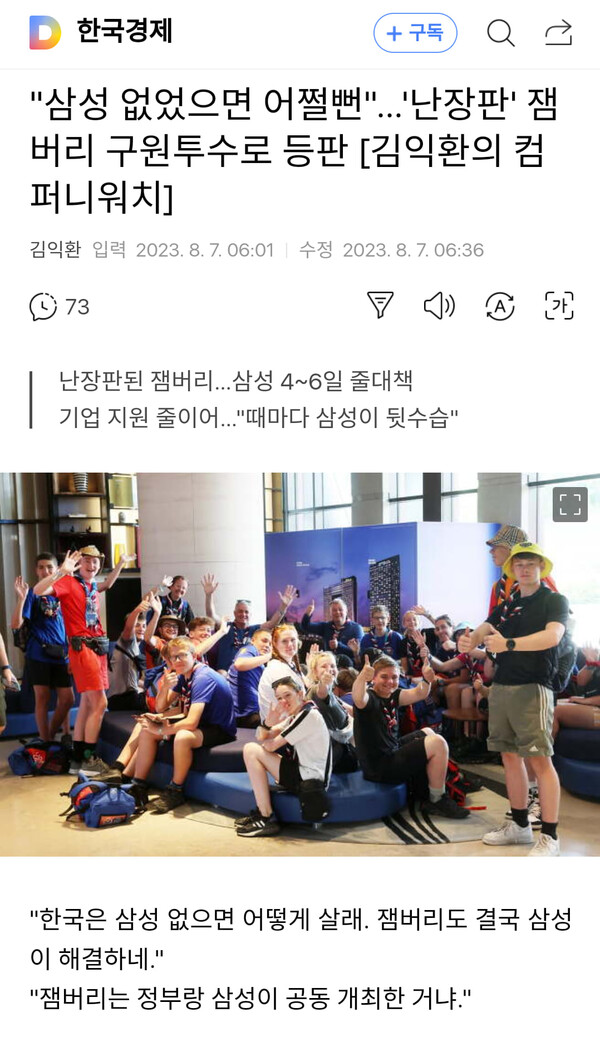 더 낯부끄러운 기사도 있다. 8월 7일자 한 경제신문 “삼성 없었으면 어쩔 뻔…난장판 잼버리 구원투수로 등판”이라는 기사다. 부제는 “기업 지원 줄이어…때마다 삼성이 뒷수습”이다.