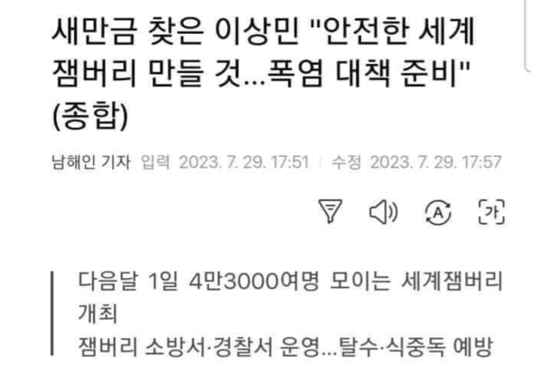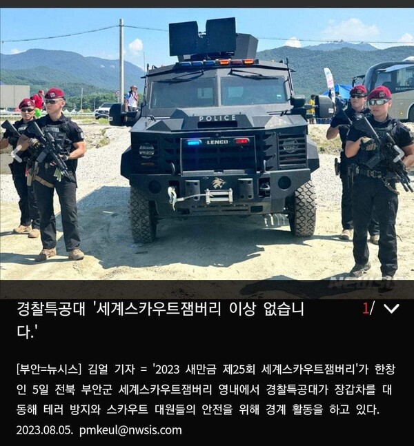 온열 탈진과 더러운 위생, 부족한 의료진 등 ‘망신 뉴스’가 외신에서 잇따라 터져 나올 때, 국내 한 매체는 “경찰특공대 ‘세계스카우트잼버리 이상 없습니다’”라는 제목의 사진 기사를 포털에 투척했다. 소총으로 무장한 경찰특공대원들이 장갑차를 세워놓고 새만금 잼버리 대회 현장을 지키고 있다는 내용이다. 폭염에 지쳐 쓰러진 전세계 4만여 청소년 스카우트들이 한국 정부가 보낸 경찰특공대원들 덕에 ‘이상 없이’ 무사했다는 메시지일까?