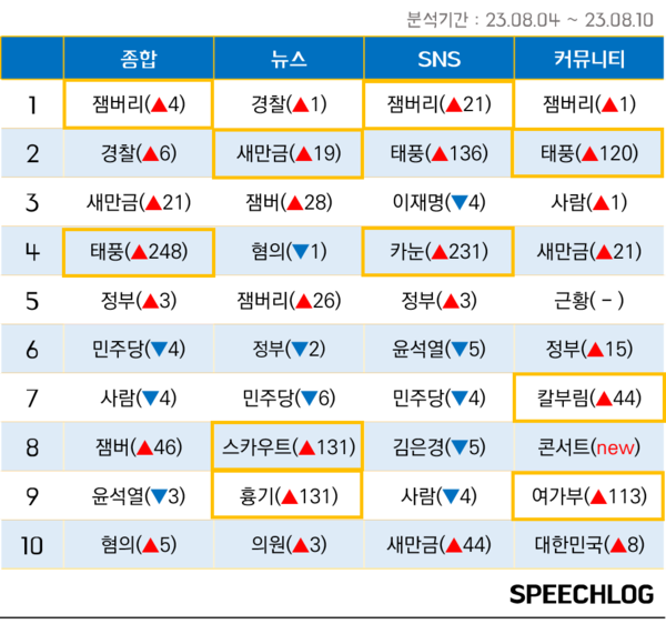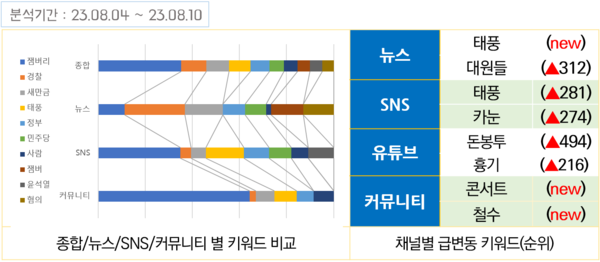 ‘잼버리’는 SNS와 커뮤니티에서 최다 언급량 키워드 1위를 차지했다. 잼버리 관련 키워드인 ‘새만금’ ‘여가부’ ‘콘서트’ 등도 10위권에 들었다. 50여년 만에 처음 한반도를 종단 관통해 전국적인 피해 우려를 낳았던 태풍 카눈으로 인해 ‘태풍’ ‘카눈’ 등도 SNS·커뮤니티·유튜브 등에서 언급량 2위로 뛰어올랐다.