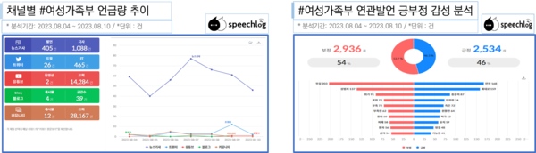 잼버리 대회의 주관 부처인 여성가족부 연관발언 긍부정어는 부정이 54%으로 긍정 46%보다 높았다. 부정어로는 ‘부실’ ‘성범죄’ ‘위기’ 등이었고 긍정어는 ‘안전’ ‘제대로’ 등이었다.
