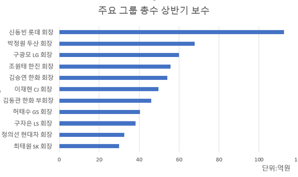 주요 그룹 반기보고서에 따르면 올해 상반기 가장 많은 보수를 받은 재벌 총수는 신동빈 롯데그룹 회장이다. 신 회장은 롯데지주와 6개 계열사에서 총 112억5400만 원을 챙겼다. 지난해 상반기 102억8500만 원보다 10억여 원가량 더 많았다. 롯데지주에서 45억3300만 원을, 롯데쇼핑과 롯데케미칼에서 각각 11억500만 원과 19억1500만 원을 받았다.