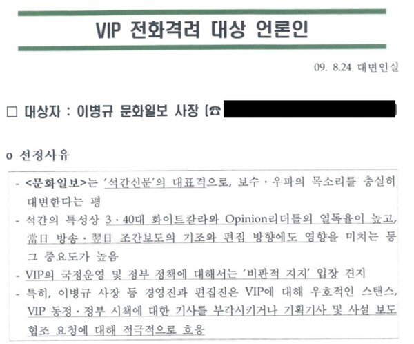 민형배 더불어민주당 의원실이 최근 공개한 ‘VIP 전화격려 필요 언론인’ 제목의 청와대 대변인실 작성 보고서를 보면, 이동관 대변인실은 정권 첫해인 2009년 7~8월 ‘VIP(대통령)가 전화로 칭찬·격려해 줄 언론인’으로 현재 문화체육관광부 장관인 중앙일보 박보균 편집인, 동아일보 배인준 논설주간, 서울신문 이동화 사장, 문화일보 이병규 사장 등이 선정됐다.