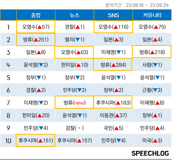 한 주 동안 언론 뉴스·SNS·커뮤니티·유튜브 등 모든 미디어 플랫폼의 최대 관심은 ‘일본 핵 오염수 방류’ 사건이었다. 언론 뉴스에서 언급량이 크게 늘어 ‘오염수’ 키워드는 63단계 상승한 3위, ‘방류’는 새로 10위권 진입, ‘후쿠시마’는 157단계나 상승한 10위를 기록했다.