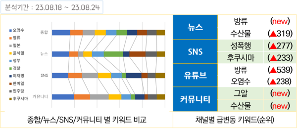 SNS와 커뮤니티에서도 ‘오염수’ ‘일본’ 언급량이 급증하면서 최다 언급량 1, 2위를 차지했다. 유튜브에서도 언급량 순위가 ‘오염수’ 238단계, ‘방류’ 539단계나 급상승했다.