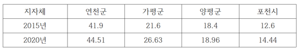 중앙정부 청사가 있는 과천시, 경기도청이 있는 수원시와 의정부시를 빼면 역시 소멸위험지수가 높은 지자체가 ‘공공 행정, 국방 및 사회보장 행정’ 분야의 지출이 지역내총생산에서 차지하는 비중이 높다는 것을 확인할 수 있다. 연천군의 경우는 군부대가 있어 그 비율이 더욱 높게 계산된 것으로 보인다. 네 개 시·군의 데이터를 2015년 데이터와 비교하면 네 지역 모두 그 비율이 높아졌음을 아래 표로 확인할 수 있다.