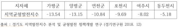 역시 가평군이 소멸위험도가 가장 높다. 여주시와 포천시의 순위가 바뀌었지만 노령화지수가 높은 6개 시·군이 역시 소멸위험도 높은 지자체에 그대로 이름을 올렸다. 이런 인구 구조는 지역발전의 큰 저해요인이기도 하다. 아래 표는 경기도가 개발한 지역균형발전지수 최하위의 지자체 현황이다.