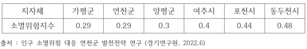 65세 이상 주민 3명쯤은 봐야 어린이 한 명을 만날 수 있는 곳이 지금의 가평군이고 10년쯤 뒤 대한민국의 모습이다. 이런 높은 고령층 비율은 당연히 소멸위험지수(20~39세 여성 인구 수 / 65세 이상 고령인구 수)에도 영향을 미친다. 태어날 아이의 수보다 돌아가실 어르신의 수가 더 많을 가능성이 높은 곳, 그래서 자연적인 소멸의 가능성이 높은 곳들. 아래 표는 경기도 31개 시·군 중 가장 소멸위험지수가 높은 지자체 현황이다.
