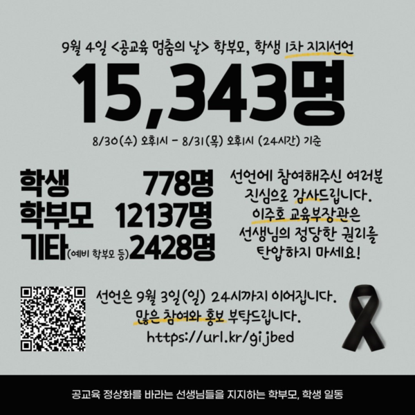 학부모·학생들이 시작한 멈춤의 날에 대한 지지 선언은 하루 만에 1만 5000명을 넘었다. 이 선언은 지난 30일 부산의 한 학부모가 구글폼을 활용한 온라인 서명(https://omn.kr/25g2t)을 제안하며 시작됐다.