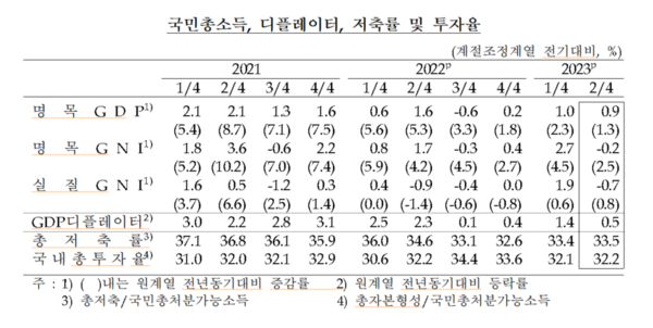 2분기 명목 국민총소득(GNI)은 직전 분기보다 0.2% 줄었다. 명목 국외순수취요소소득이 19조 3000억 원에서 13조 7000억 원으로 크게 줄어 명목 GDP 성장률(0.9%)을 밑돌았다.