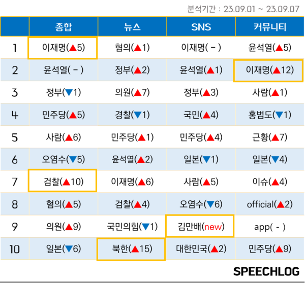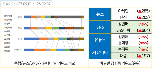 단식투쟁 중인 더불어민주당 이재명 대표는 SNS, 커뮤니티 등 디지털 플랫폼에서 언급량 1~2위에 올랐지만 언론 뉴스에서는 7위 정도로 주목을 받지 못했다. 목숨을 건 단식이 일주일 넘게 지속되고 있지만, 언론은 여전히 냉소적이거나 무관심하다. 언론 뉴스에 285단계나 급상승한 키워드는 ‘아세안’이었다. 윤석열 대통령의 아세안 순방 때문이다.