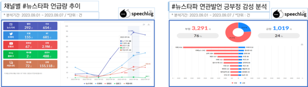 ‘뉴스타파’ 연관 키워드를 보면 ‘김만배’ ‘인터뷰’ ‘허위’ ‘가짜뉴스’ ‘신학림’ 등이 나온다. 연관발언 긍부정어 분석에서도 76%가 ‘부정’이었다. 부정어로는 ‘의혹’ ‘가짜뉴스’ ‘공작’ ‘위반’ 등이 많았다.