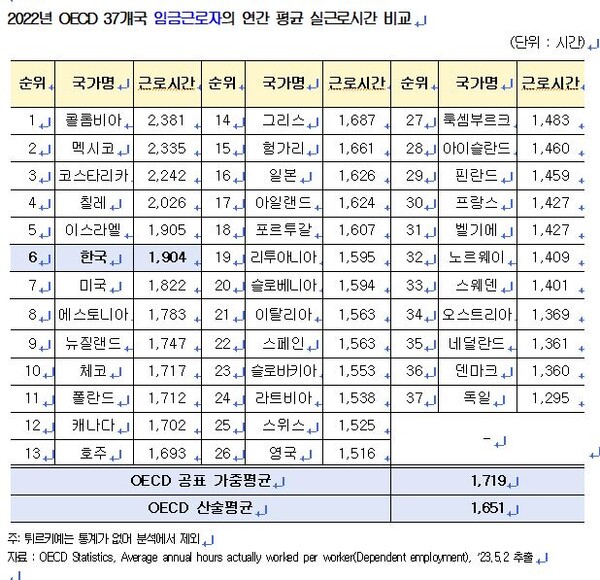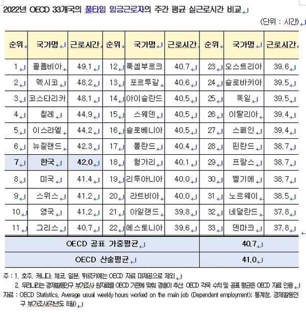 한국, OECD 37개국 중 6위로 아직 장노동인데