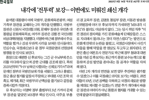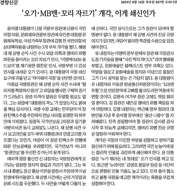 그나마 윤 정권에 비판적 목소리를 내고 있는 경향·한겨레가 다른 목소리를 냈다. 한겨레는 “싸움꾼 전면 내세운 돌려막기, 개악된 개각” 사설에서 “강경파 장관을 이념전쟁의 선봉장으로 삼겠다는 취지가 명백해 보인다”면서 “윤 대통령이 싸우라고 했고 싸우는 데 적합한 전사들을 골랐다. 도대체 누구와 싸우겠다는 말인가”라고 비판했다. 경향신문은 “오기·MB맨·꼬리자르기 개각, 이게 쇄신인가” 제목 사설에서 “해병대 채 상병 순직 사건 수사외압 의혹과 잼버리 파행 파문을 줄이려는 꼬리자르기 인사, 이명박 올드보이를 재기용한 회전문 인사, 국방부엔 더 강성인사를 내세운 오기 인사”라고 혹평했다.