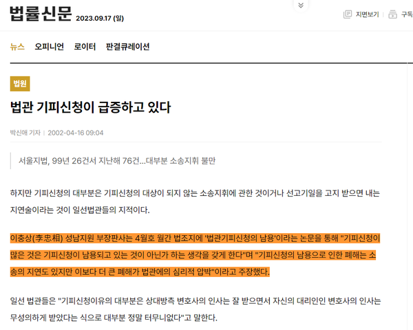 즉 이충상은 자신이 판사이던 당시엔 논문에서 재판부 기피신청에 대해 “폐해”라며 비판적 입장을 분명히 했는데, 17년 후 ‘조국 사태’ 국면에서는 검찰더러 재판부 기피신청을 하라고 역설하는 기막힌 모습을 보인 것이다. 판례도 무시한 억지 논리로 검찰더러 “법관에 대한 심리적 압박”을 하라고 권한 이충상에 대해 17년 전 ‘부장판사 이충상’은 뭐라고 평할지 궁금할 지경이다.