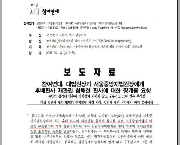 실제 이 사건이 불거진 바로 다음 달인 2005년 10월, 참여연대는 보도자료를 내며 공식적으로 대법원장과 서울중앙지법원장에 징계를 요청했다. 한겨레 보도로 촉발된 논란이 더 크게 불거진 것이다. ☞ 참여연대, 대법원장과 서울중앙지법원장에게 후배판사 재판권 침해한 판사에 대한 징계를 요청