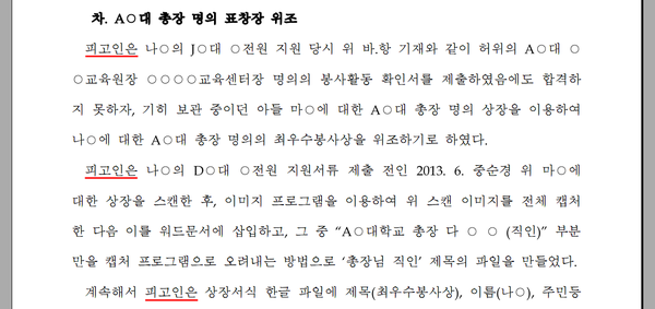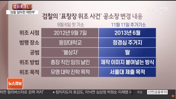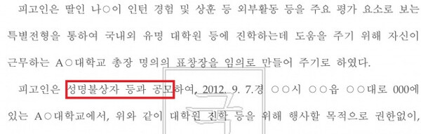 ‘총장 직인을 실제로 찍었다’라던 1차 공소장의 공소사실 내용에 비춰보면, 검찰이 이 존재하지 않는 ‘성명불상자’에게 맡긴 역할은 ‘총장 직인 날인‘을 도와줬다는 취지였다.
