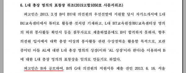 아래 이미지는 1심 판결문에서 표창장 위조 혐의에 대한 공소사실로서, 소제목 뒤에 명시되어 있다시피 ‘2019고합1050’ 공소사실, 즉 ‘공소장변경 불허’ 이후 12월 17일에 추가로 기소한 공소장의 내용이다. 보다시피 “피고인은 B과 공모하여”라고 되어 있는데, 여기서 익명 처리된 ‘B’가 조민이다. (검찰은 이 혐의의 결론 부분에도 ‘조민과 공모하여’라고 다시 한번 적시했다.)
