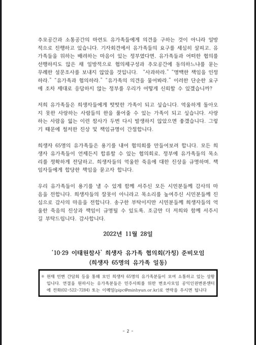 안녕하십니까? 저희는 있어서는 안 될 ‘10·29 이태원참사’ 희생자 유가족들입니다. 참사로 인해 억울하게 세상을 떠난 158명의 희생자들을 추모해주시고, 기억해주시며, 물심양면으로 유가족들과 연대해주시는 모든 분들께 감사한 마음을 전합니다. 그리고 참사로 마음과 건강을 다친 생존자분들을 비롯한 피해자분들께도 위로의 마음을 전하며 회복을 기원합니다.