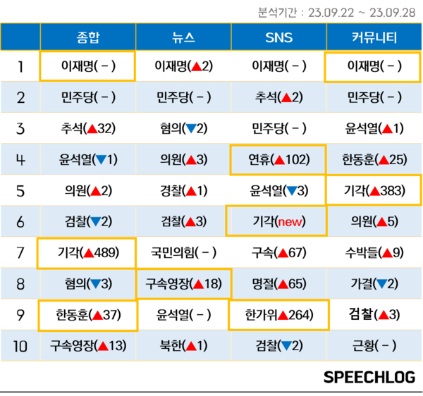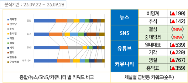 9월22일부터 추석연휴 첫날인 28일까지 언론의 뉴스와 SNS·커뮤니티·유튜브 등 디지털 플랫폼의 뉴스 키워드를 조사한 결과, 뉴스·SNS·커뮤니티 모두에서 가장 많이 언급된 키워드는 ‘이재명’이었다. ‘민주당’은 2~3위였고, ‘기각’도 디지털 플랫폼에서 언급량이 크게 늘어 언급량 순위 10위권 안에 새로 올라왔다. ‘검찰’ ‘구속영장’ ‘한동훈’ 등 이재명 대표의 구속영장 기각과 관련된 키워드도 10위권에 포함됐다.