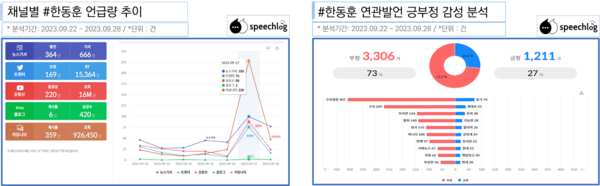 ‘구속영장’ 키워드 관련 긍부정 감성 분석 결과, 부정이 76%도 압도적이었다. 또한 ‘한동훈’ 키워드의 경우도 부정어가 73%였으며 관련 부정어로는 ‘구속영장’ ‘구속’ ‘무리한’ ‘범죄’ ‘탄핵’ 등이 언급됐다.