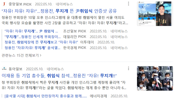 이뿐인가. 윤석열 대통령 취임식에 참석한 정용진 신세계그룹 부회장이 관련 사진 2장을 붙여 “자유! 자유! 자유! 무지개!”라는 글을 올리자 조중동을 포함한 언론들은 이를 ‘대서특필’했다. 점입가경이었다.