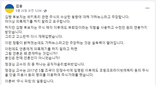 그 외에도 김웅 의원이 거론한 김행 후보자의 행위, ‘매각 후에도 부회장 직함 사용’, ‘수천만 원의 연봉’, ‘고스란히 다시 재매입’ 역시 정 교수의 사례에서 전혀 없었던 일이다. 즉 김행 후보자의 사례와 완전히 다른데도 불구하고 억지로 정 교수를 끌어다 붙인 것이다.