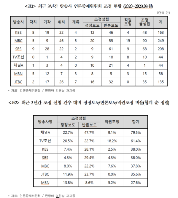 더불어민주당 민형배 의원실이 지난 2020년부터 올해 8월까지 방송(지상파 3사와 종편채널 4사)에 제기된 언중위 조정신청·결과 자료를 분석해보니, 조정 비율이 가장 높은 방송사 1, 2위는 채널A, TV조선인 것으로 나타났다.